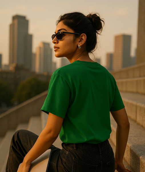 in playful, curvy typography. Printed on a rich green backdrop, this tee is