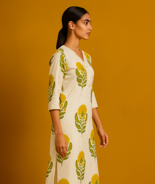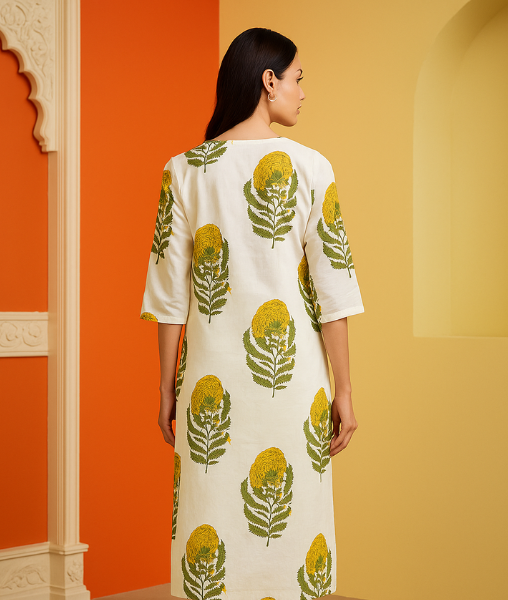A must-have piece in your ethnic wardrobe, the Pehar Yellow Floral Cotton Kurta blends timeless style with every-day practicality, making it one of the best choices in ethnic wear for women.