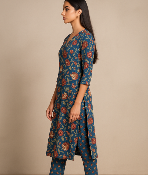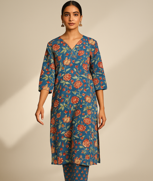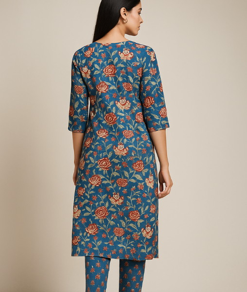Bring timeless elegance to your everyday wardrobe with this Blue Floral Cotton Kurta Set. Crafted in breathable cotton, it features vibrant red and orange floral prints that add a refreshing pop of color. The straight-cut silhouette with three-quarter sleeves ensures comfort, while the matching pants complete the coordinated look. Perfect for casual outings, office wear, or festive gatherings, this set blends tradition with modern charm.