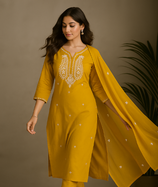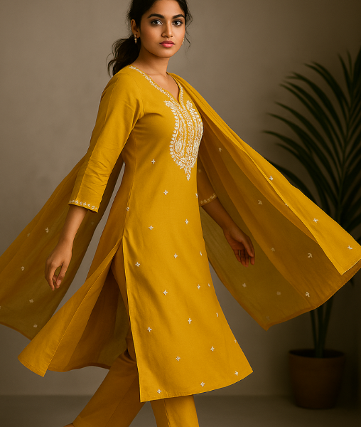 This ethnic wear for women set includes a cotton kurta, matching pants, and a dupatta for a complete traditional look.
