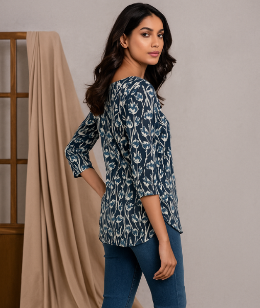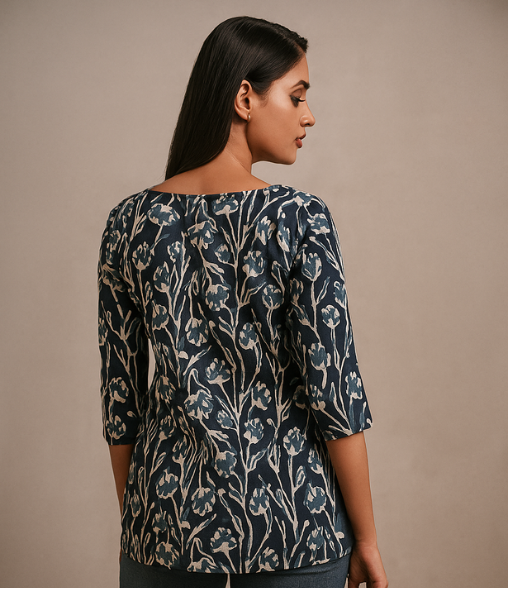 Add a touch of effortless charm to your wardrobe with this navy blue cotton short kurta featuring elegant off-white botanical prints. Designed with a round neckline and three-quarter sleeves, it offers a timeless silhouette that blends comfort with sophistication. Perfect for casual outings or office wear, this kurta pairs beautifully with denims or straight-fit pants.