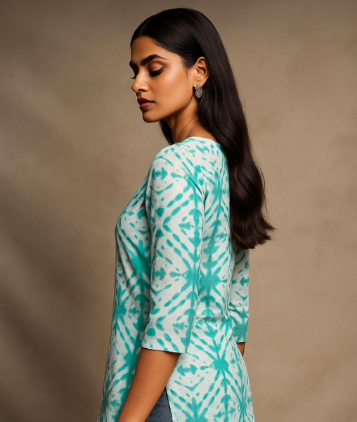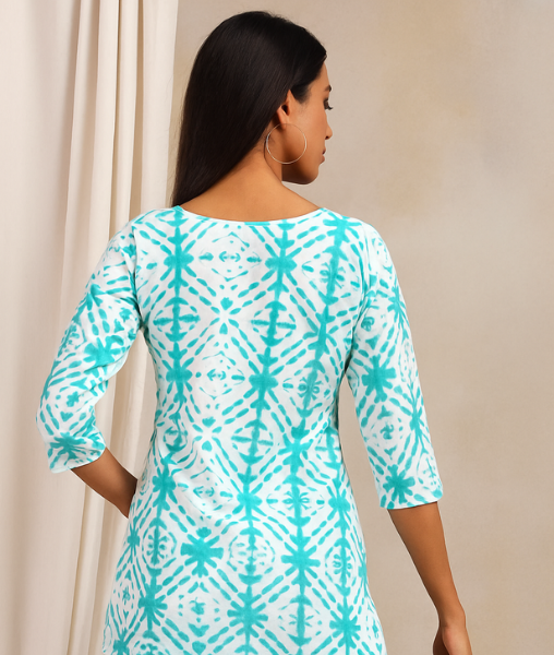 Elevate your everyday style with this refreshing aqua blue short kurta featuring a stunning tie-dye inspired pattern. Made from soft and breathable cotton, it ensures all-day comfort while adding a touch of artistic charm. The notched neckline and three-quarter sleeves make it a perfect pick for casual outings or workwear. Pair it with jeans or white trousers for an effortlessly chic look.