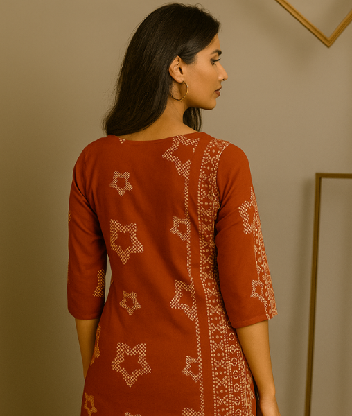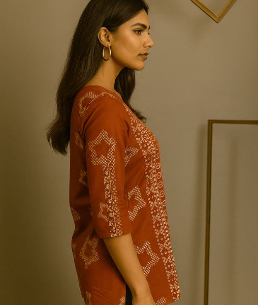 Add a touch of earthy elegance to your wardrobe with this rust orange short kurta featuring intricate star and geometric hand block prints. Crafted from premium cotton, it offers a soft, breathable feel perfect for everyday wear. The asymmetrical print placement and three-quarter sleeves lend it a contemporary yet traditional charm. Ideal for pairing with jeans or straight pants, this kurta beautifully balances comfort and sophistication.
