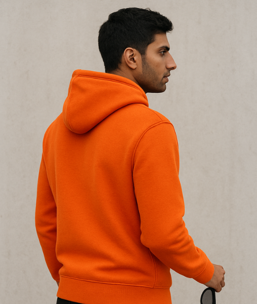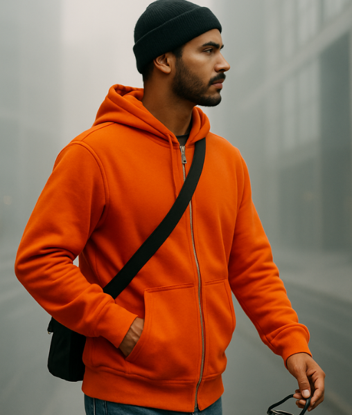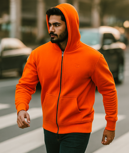Featuring a minimal streetwear aesthetic, full-zip closure, and cozy kangaroo pockets, it’s built for everything — from coffee runs to chill evenings. The vibrant tangy orange hue adds an instant pop to your look, blending warmth with attitude.